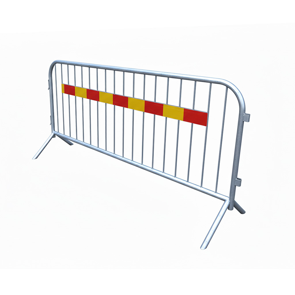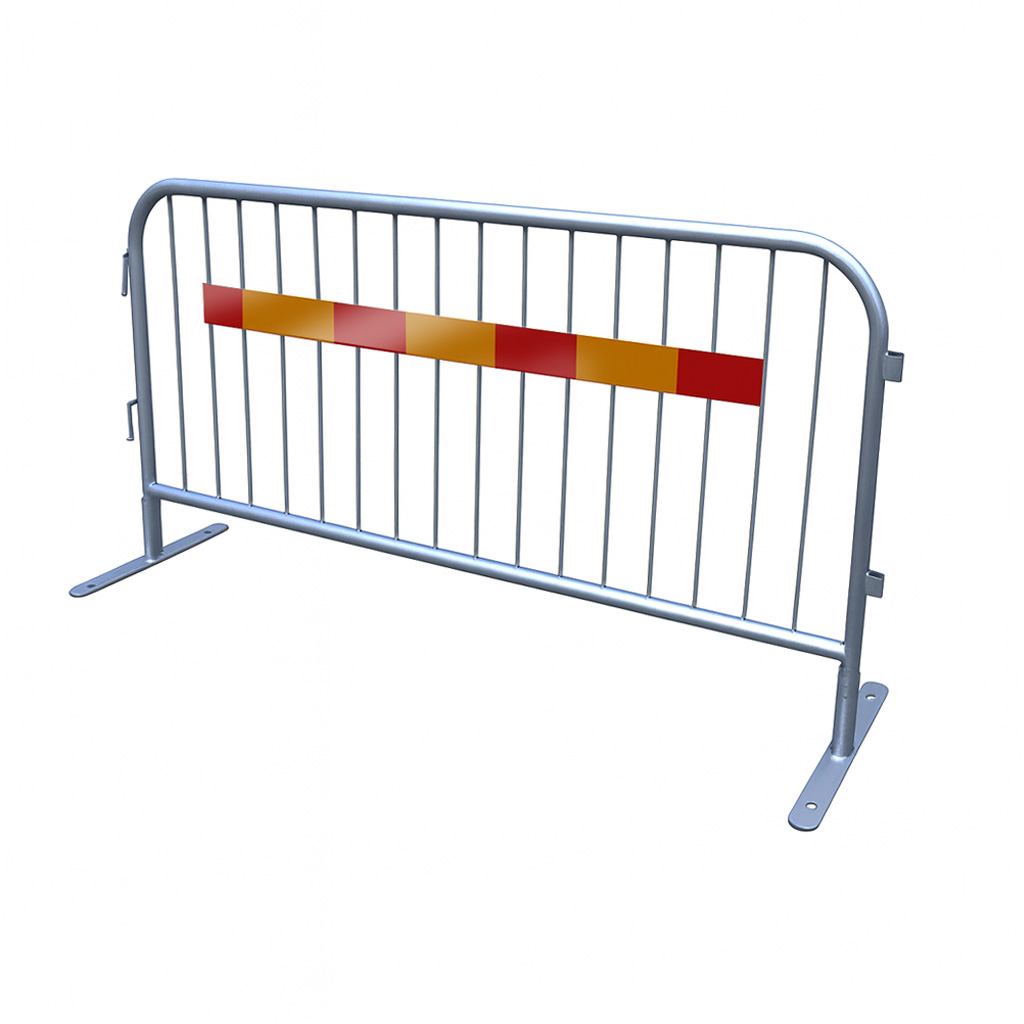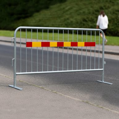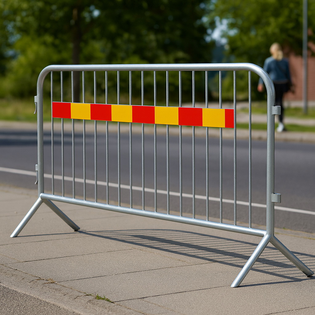 Två modeller av kravallstaket: en med stabil T-fot för maximal balans och en med lättare V-fot för smidig hantering. Båda varmgalvaniserade, hållbara och perfekta för snabb, säker avspärrning.